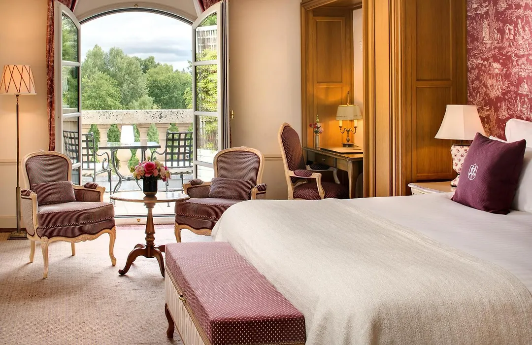 Les 92 chambres de l'Auberge du Jeu de Paume sont des havres de calme, avec des murs crème et des tissus en toile de Jouy décorés de scènes pastorales. Les suites prestigieuses disposent de balustrades idéales pour des repas privés avec vue sur les jardins du château.